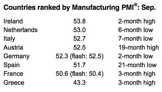 Ο σύνθετος δείκτης υπεύθυνων προμηθειών (PMI) της Markit για τον Σεπτέμβριο, σύμφωνα με τα τελικά στοιχεία, διαμορφώθηκε στα χαμηλότερα επίπεδα των τελευταίων τεσσάρων μηνών, στις 53,6 μονάδες, κάτω από τις αρχικές εκτιμήσεις για 53,9.