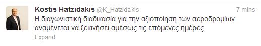 Μέσω twitter ανακοίνωσε την έναρξη των διαγωνισμών για την αξιοποίηση των αεροδρομίων ο υπουργός Ανάπτυξης, Κωστής Χατζηδάκης.