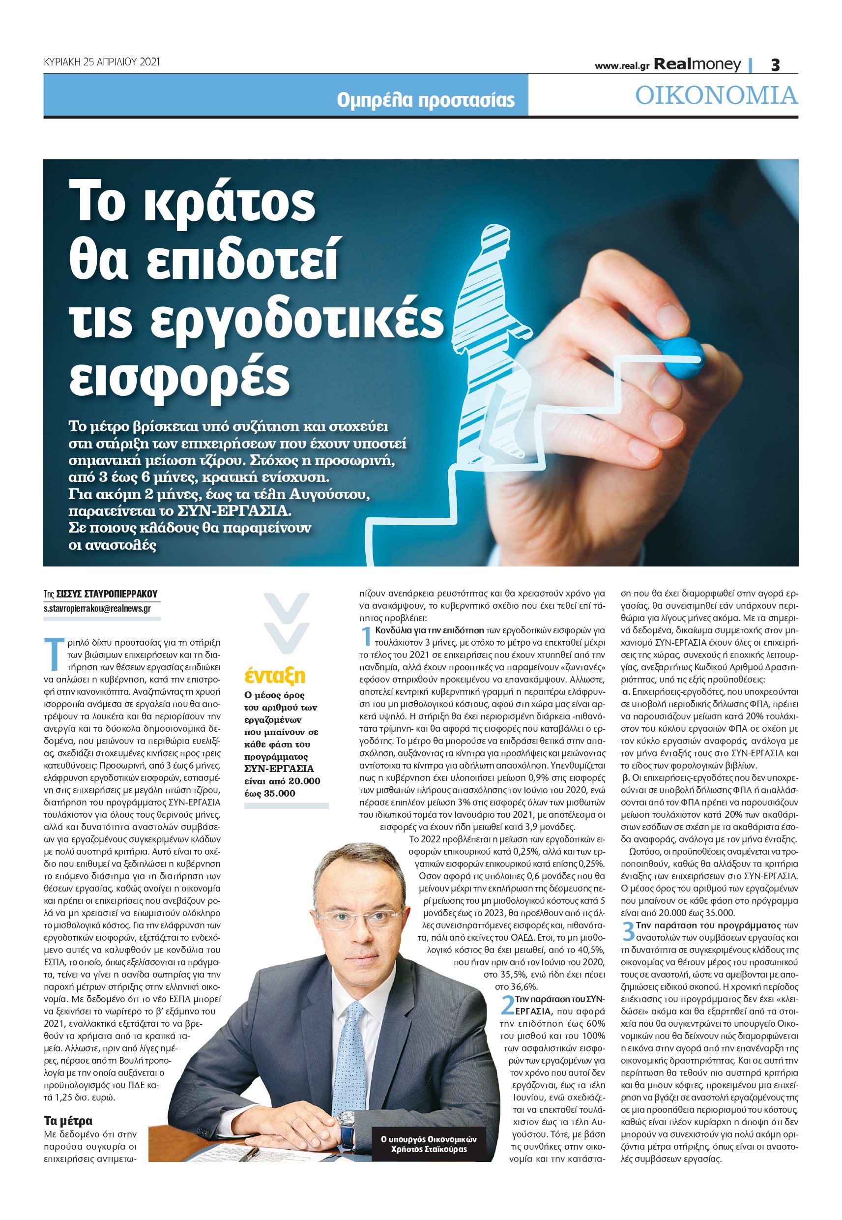 Αναζητώντας τη χρυσή ισορροπία ανάμεσα σε εργαλεία που θα αποτρέψουν τα λουκέτα και θα περιορίσουν την ανεργία και τα δύσκολα δημοσιονομικά δεδομένα, που μειώνουν τα περιθώρια ευελιξίας, σχεδιάζει στοχευμένες κινήσεις προς τρεις κατευθύνσεις: Προσωρινή, από 3 έως 6 μήνες, ελάφρυνση εργοδοτικών εισφορών, εστιασμένη στις επιχειρήσεις με μεγάλη πτώση τζίρου, διατήρηση του προγράμματος ΣΥΝ-ΕΡΓΑΣΙΑ τουλάχιστον για όλους τους θερινούς μήνες, αλλά και δυνατότητα αναστολών συμβάσεων για εργαζομένους συγκεκριμένων κλάδων με πολύ αυστηρά κριτήρια.