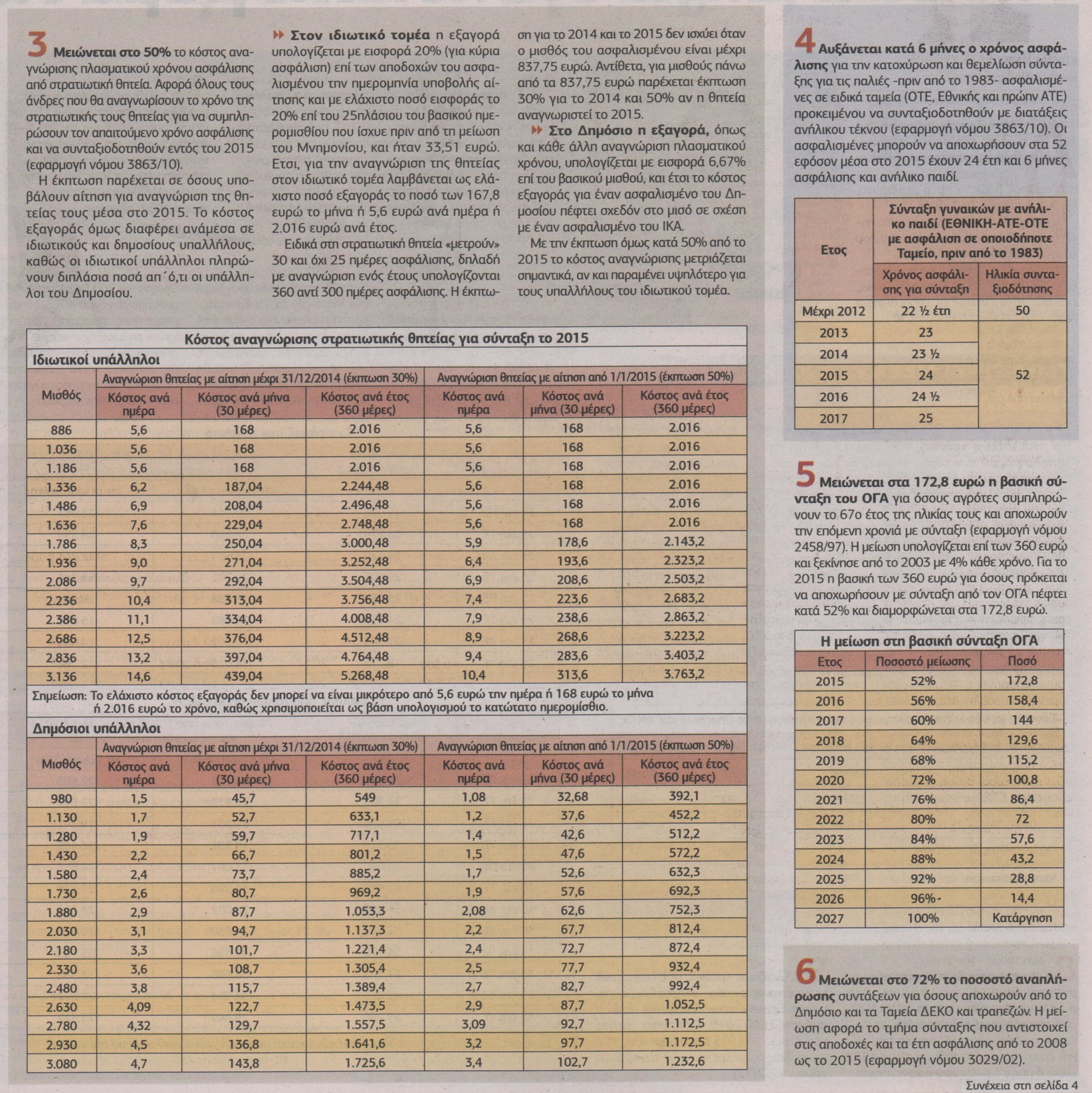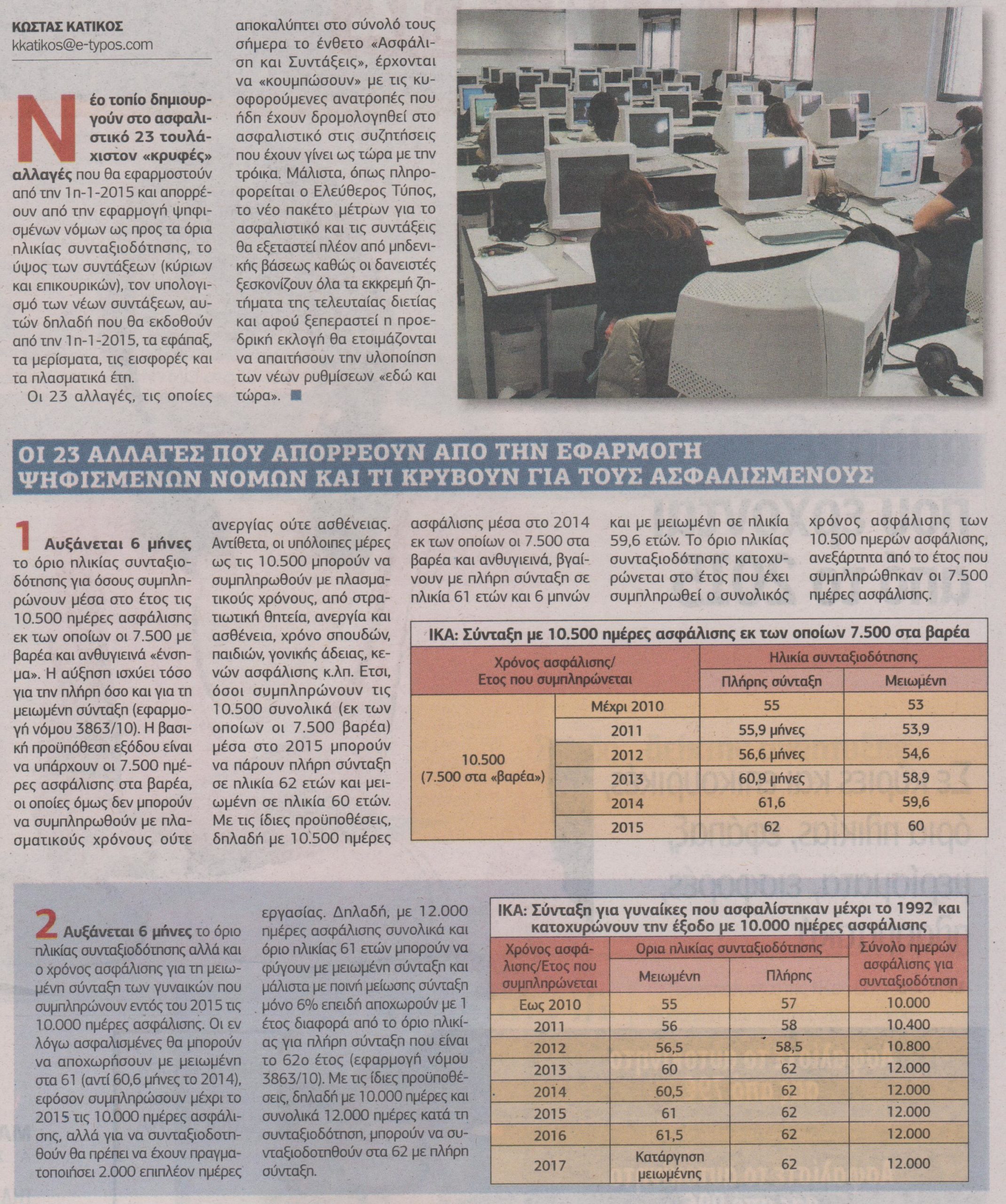 Νέο τοπίο δημιουργούν στο ασφαλιστικό 23 τουλάχιστον «κρυφές» αλλαγές που θα εφαρμοστούν από την 1η-1-2015 και απορρέουν από την εφαρμογή ψηφισμένων νόμων ως προς τα όρια ηλικίας συνταξιοδότησης, το ύψος των συντάξεων (κύριων και επικουρικών), τον υπολογισμό των νέων συντάξεων, αυτών δηλαδή που θα εκδοθούν από την 1η-1-2015, τα εφάπαξ, τα μερίσματα, τις εισφορές και τα πλασματικά έτη.