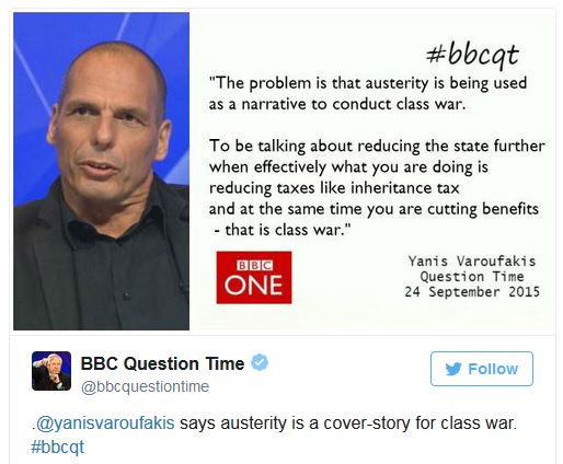 Στον αντίποδα ο πρώην υπουργός Οικονομικών στην προηγούμενη κυβέρνηση ΣΥΡΙΖΑ-ΑΝΕΛ έπλεξε το εγκώμιο του Τζέρεμι Κόρμπιν του νέου ηγέτη των Εργατικών ο οποίος προέρχεται από την αριστερή πτέρυγα του κόμματος αναφέροντας πως «είναι το καλύτερο πράγμα που έχει βγει το τελευταίο διάστημα από τη Βρετανία. Αρκεί να σκεφτεί κανείς τον ταξικό πόλεμο που διεξάγει η βρετανική κυβέρνηση. Μειώνει το φόρο κληρονομιάς και ταυτόχρονα κόβει και τα επιδόματα. Αυτό δεν είναι τίποτα άλλο από ταξικός πόλεμος».