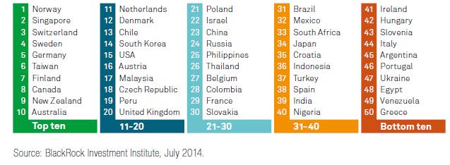 Στον αντίποδα, η Νορβηγία κατατάσσεται στην πρώτη θέση των χωρών με το μικρότερο κίνδυνο χρεοκοπίας. Στην δεκάδα με τις πιο ασφαλείς για τους επενδυτές χώρες περιλαμβάνονται ακόμα η Σιγκαπούρη, η Ελβετία, η Σουηδία, η Γερμανία, η Ταϊβάν, ο Καναδάς, η Νέα Ζηλανδία και η Αυστραλία.