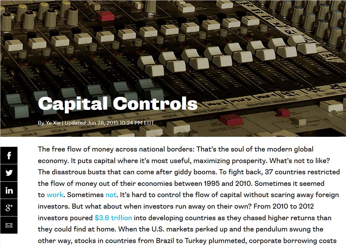 Πολλοί οικονομολόγοι λένε ότι υπάρχει συγκεκριμένος χρόνος και τόπος για έλεγχο στην κίνηση των κεφαλαίων, ενώ υπάρχει ανοιχτή η αντιπαράθεση στην καυτή συζήτηση για το εάν λειτουργούν. Περιορισμοί π.χ. στην κίνηση κεφαλαίων για να αποφευχθεί η υπερτίμηση ενός νομίσματος και οι χρηματοπιστωτικές φούσκες.