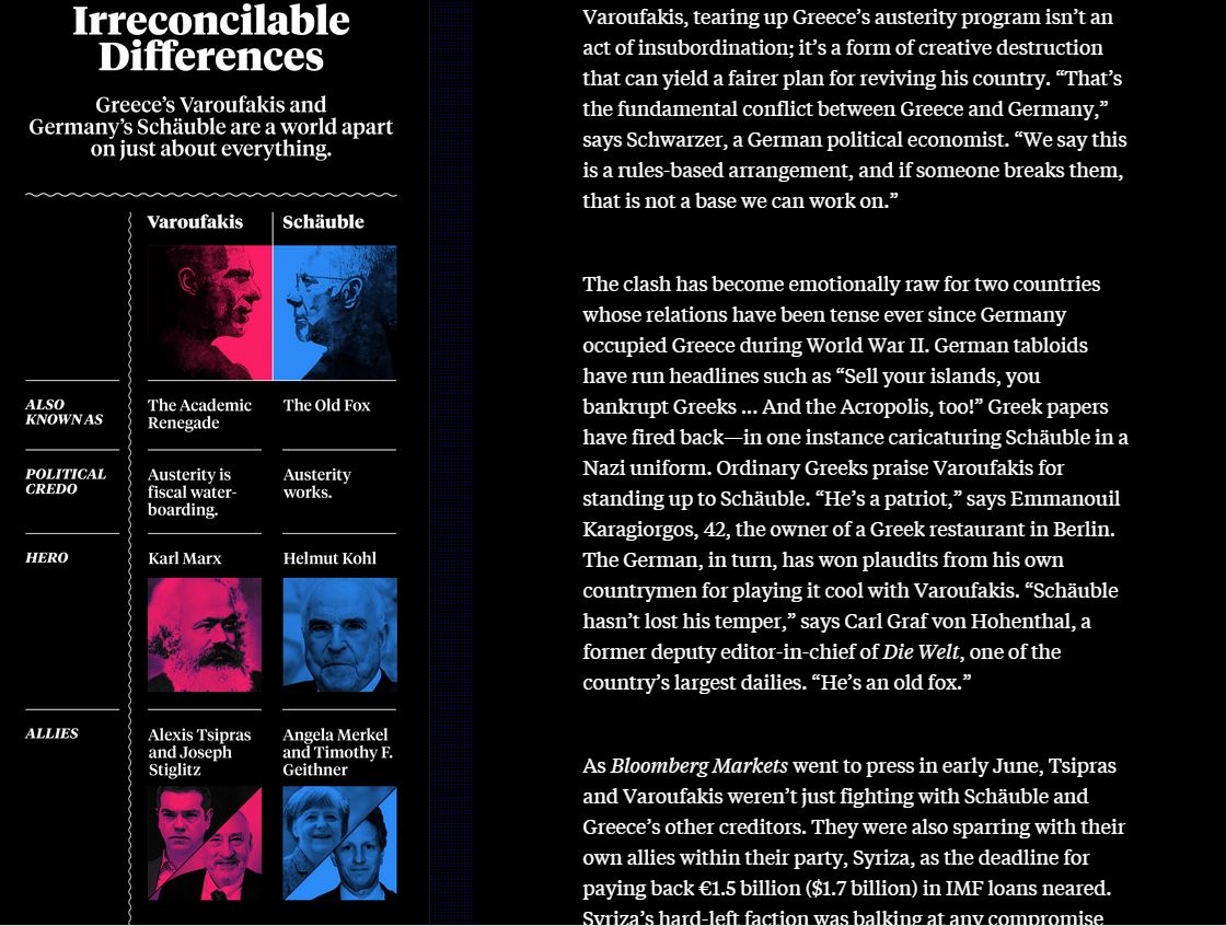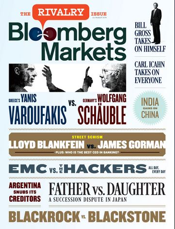 Τη μάχη των αντιθέτων μεταξύ Βαρουφάκη – Σόιμπλε, στον πόλεμο στρατηγικής και τακτικής για τη διέξοδο από την κρίση παρουσιάζει στο πρωτοσέλιδο η έκδοση του Bloomberg Market.