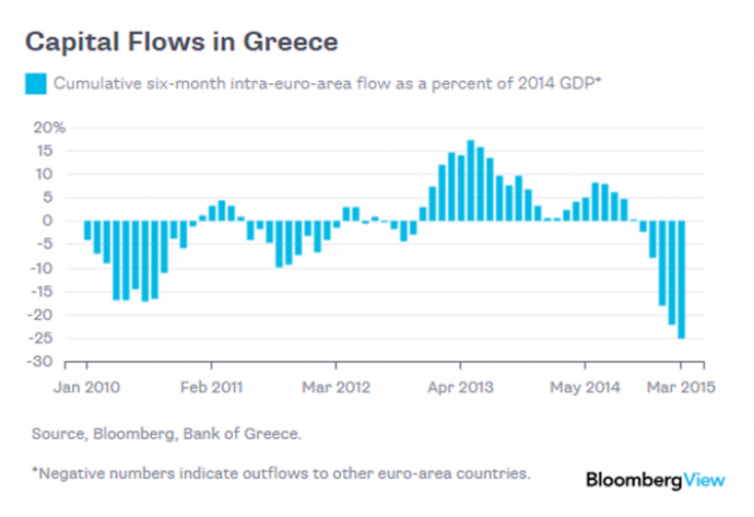 Στα 62 δισ. ευρώ ανέρχεται η φυγή κεφαλαίων από τις ελληνικές τράπεζες τους τελευταίους έξι μήνες σύμφωνα με δημοσίευμα του Bloomberg τη Δευτέρα με τίτλο «Χαρτογραφώντας το τρομακτικό μέλλον της Ελλάδας».