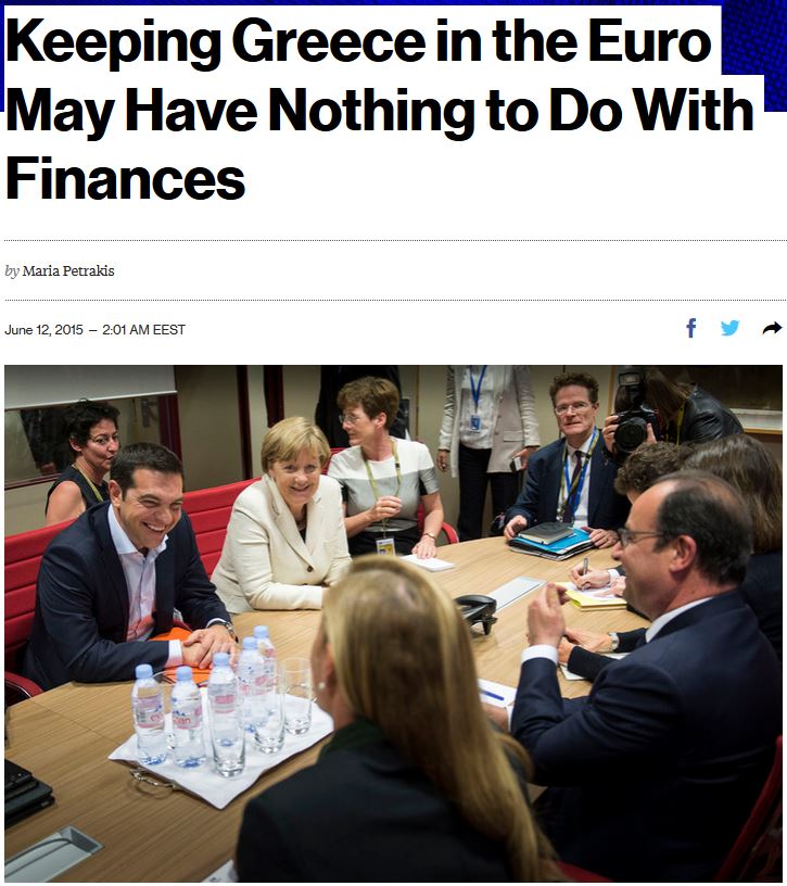 Η παραμονή της Ελλάδας στην ευρωζώνη και η αποφυγή της στάσης πληρωμών, της χρεοκοπίας δηλαδή και ενός Grexit, δεν είναι μόνο οικονομικό ζήτημα αλλά και γεωπολιτικό αναφέρει σχόλιο στο Bloomberg.