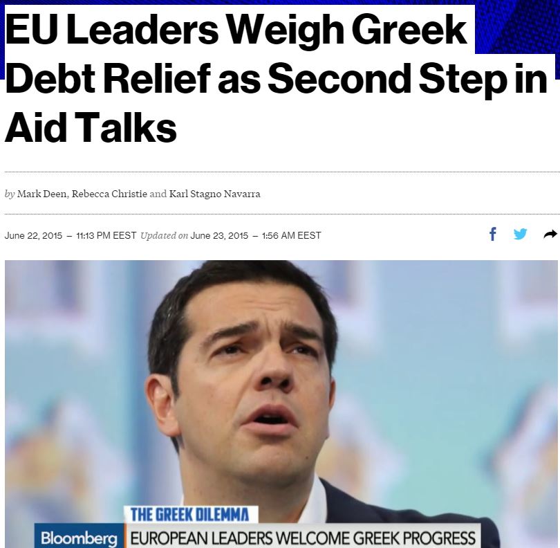 Παίζουν τώρα με τη διευθέτηση του χρέους οι δανειστές στο τραπέζι του άγριου πόκερ της διαπραγμάτευσης για συμφωνία με την Ελλάδα, ζητώντας πρώτα μέτρα, αναφέρει το Bloomberg με τίτλο: «Οι ηγέτες της Ευρωζώνης σταθμίζουν την ελάφρυνση του ελληνικού χρέους ως δεύτερο βήμα στις συζητήσεις για τη βοήθεια».