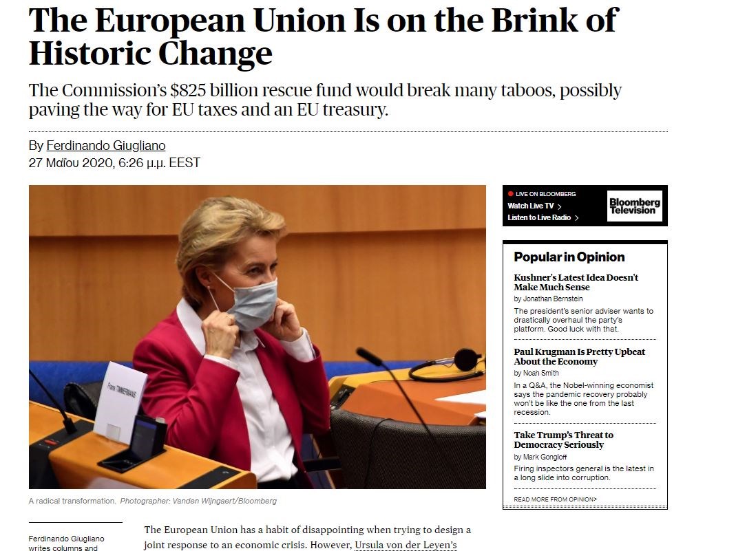 Ιστορία γράφει η Κομισιόν με το Ταμείο Ανάκαμψης των 750 δισ. ευρώ, αν και η ΕΕ έχει συνήθεια να απογοητεύει στην προσπάθεια σχεδιασμού κοινής απάντησης στην οικονομική κρίση, σύμφωνα με άρθρο γνώμης που φιλοξενεί του Boomberg. Όπως επισημαίνει ο αρθρογράφος, η ομιλία της προέδρου της Κομισιόν Ούρσουλα φον ντερ Λάιεν στο Ευρωκοινοβούλιο την Τετάρτη σχετικά με το Ταμείο Ανάκαμψης θα μπει στα βιβλία της ιστορίας. Η πρόεδρος της Κομισιόν περιέγραψε ένα πρόγραμμα διάσωσης ύψους 750 δισ. ευρώ, προκειμένου να βοηθήσει το μπλοκ να διαχειριστεί τις επιπτώσεις το κορονοϊού. Οι κυβερνήσεις της ΕΕ ακόμη πρέπει να συμφωνήσουν στο σχέδιο και ορισμένα βόρεια κράτη-μέλη, ειδικά η Ολλανδία και η Αυστρία, πιθανώς θα διαφωνήσουν. Αλλά αν η τελική συμφωνία είναι έστω κοντά στην πρόταση της φον ντερ Λάιεν, θα σηματοδοτήσει μια ριζική μεταμόρφωση της Ευρώπης.