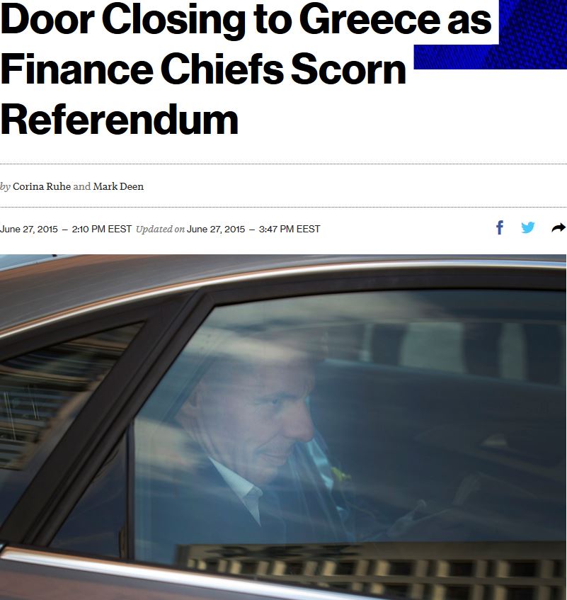 Οι υπουργοί Οικονομικών της ευρωζώνης περιφρόνησαν την απόφαση της ελληνικής κυβέρνησης για διενέργεια δημοψηφίσματος σχετικά με τους όρους «διάσωσης» της χώρας, αναφέρει το Bloomberg και είπαν πως έκλεισαν οι πόρτες για οποιαδήποτε περαιτέρω συζήτηση στο Eurogroup ώστε να αρθεί η στασιμότητα γύρω από τις διαπραγματεύσεις.
