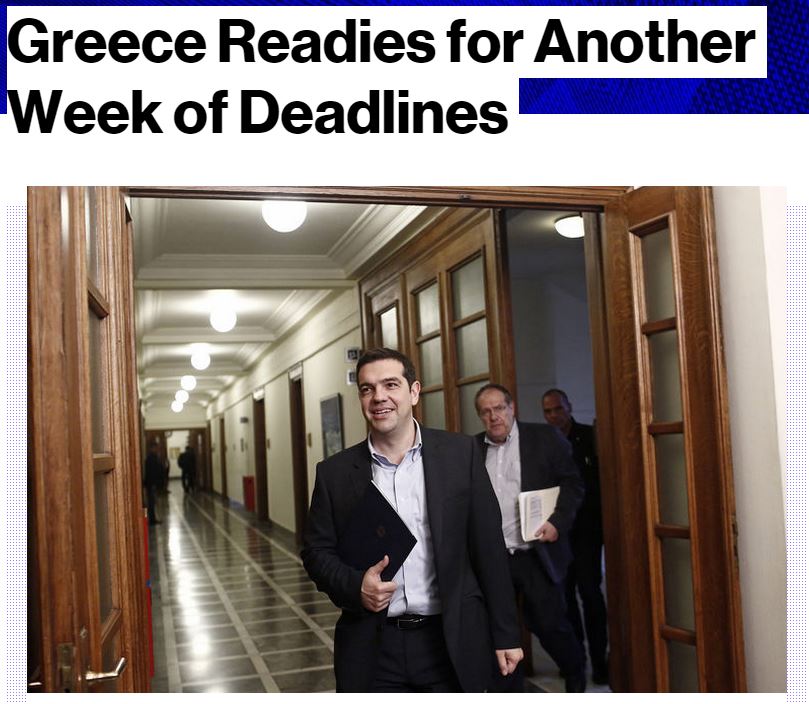 Η στάση πληρωμών κρέμεται πάνω από τις διαπραγματεύσεις της Ελλάδας και των δανειστών, πλέον σε επίπεδο κορυφής Eurogroup, αναφέρει σχόλιο στο Bloomberg, καθώς εντείνεται η αντιπαράθεση σε μια κρίσιμη εβδομάδα γεμάτη τελικές ημερομηνίες.