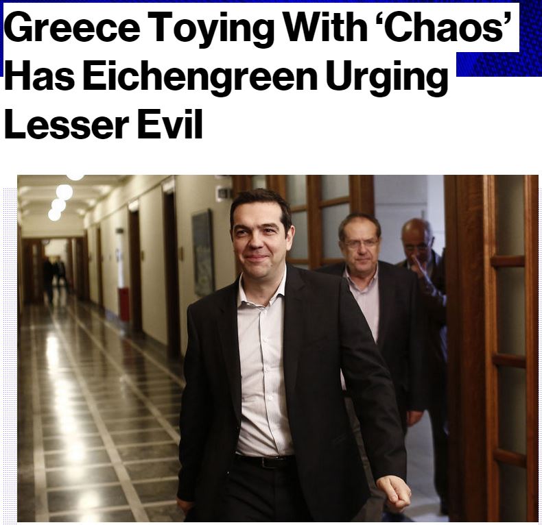 «Η παραμονή στη ζώνη του ευρώ θα είναι δαπανηρή και δύσκολη για την Ελλάδα και για τους εταίρους στην Ελλάδα, αλλά ένα Grexit θα ήταν ακόμη πιο δαπανηρό και δύσκολο», αναφέρει ο συγγραφέας του βιβλίου «Hall of Mirrors», ένα βιβλίο που αναφέρεται στις συγκρίσεις με τη Μεγάλη Ύφεση. «Η παραμονή στο ευρώ είναι το μικρότερο κακό κάτω από αυτές τις συνθήκες», αναφέρει.