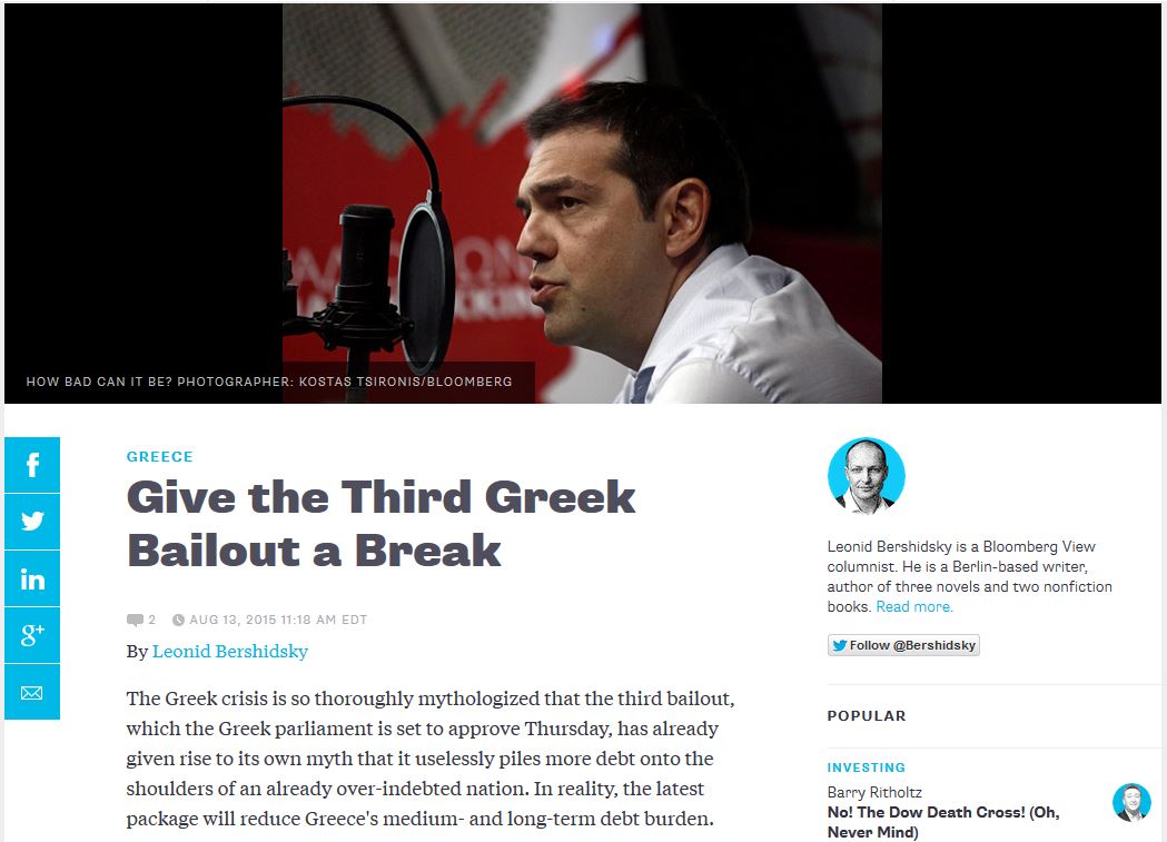 Η ελληνική κρίση έχει μυθοποιηθεί τόσο πολύ που το τρίτο πακέτο “διάσωσης” έχει ήδη δημιουργήσει το δικό του μύθο πως ρίχνει άσκοπα περισσότερο βάρος χρέους στις πλάτες ενός ήδη υπερχρεωμένου έθνους, αναφέρει σχόλιο στο Bloomberg View. Η πραγματικότητά είναι, όμως, πως το τελευταίο αυτό πακέτο θα μειώσει μεσοπρόθεσμα και μακροπρόθεσμα το φορτίο του χρέους της Ελλάδας.