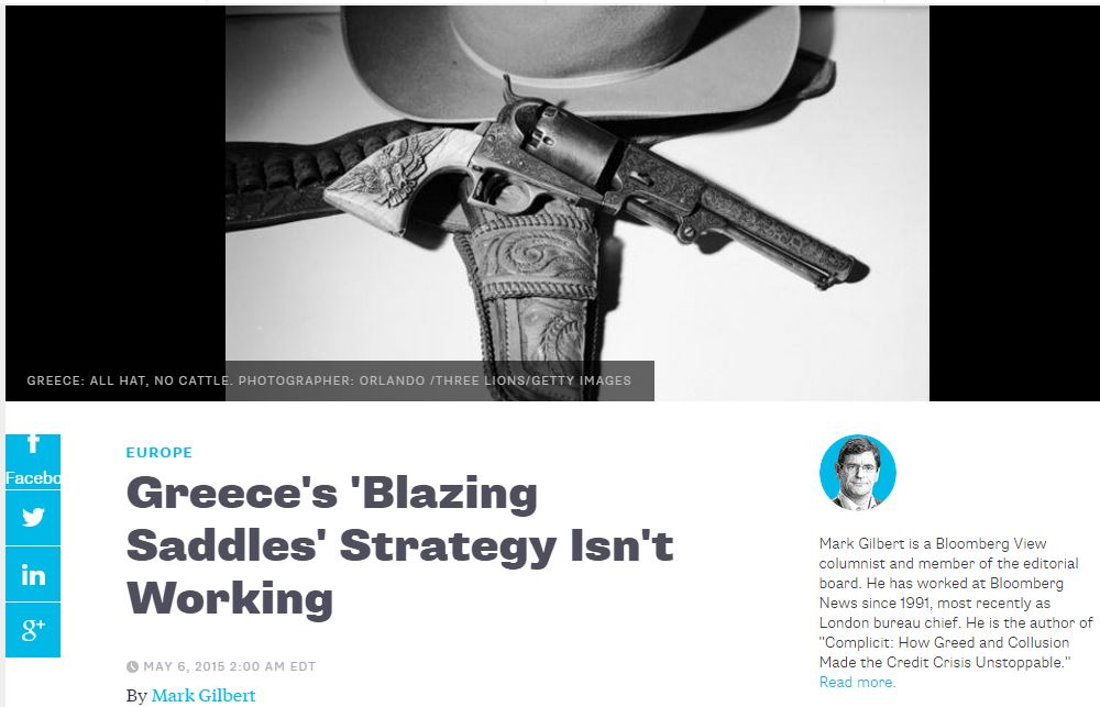 Το σατυρικό Γούστερν του Μελ Μπρουκς, «Καυτές Σέλες» θυμίζει στον αρθρογράφο του Bloomberg View το ελληνικό θρίλερ με τους θεσμούς στη θηλιά του χρέους, με τίτλο: “Η στρατηγική της Ελλάδας “Καυτές Σέλες” δεν δουλεύει”.
