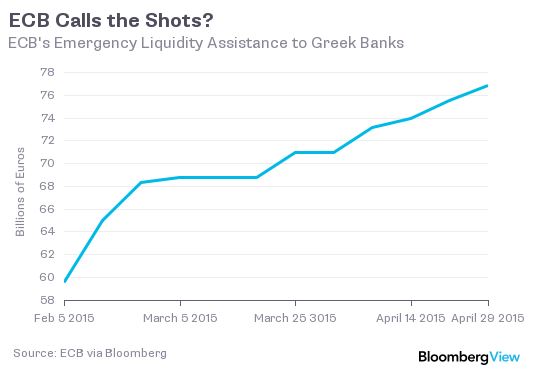 Μέχρι στιγμής, η Ευρωπαϊκή Κεντρική Τράπεζα είναι ο πιο εριστικός πιστωτής της Ελλάδα. Έχει στο γάντζο δάνειο περίπου 110 δισ. ευρώ και έχει με το ζόρι αυξήσει την έκτακτη χρηματοδότηση προς το ελληνικό τραπεζικό σύστημα κατά τους τελευταίους μήνες μέσω του προγράμματος επείγουσας παροχής ρευστότητας.