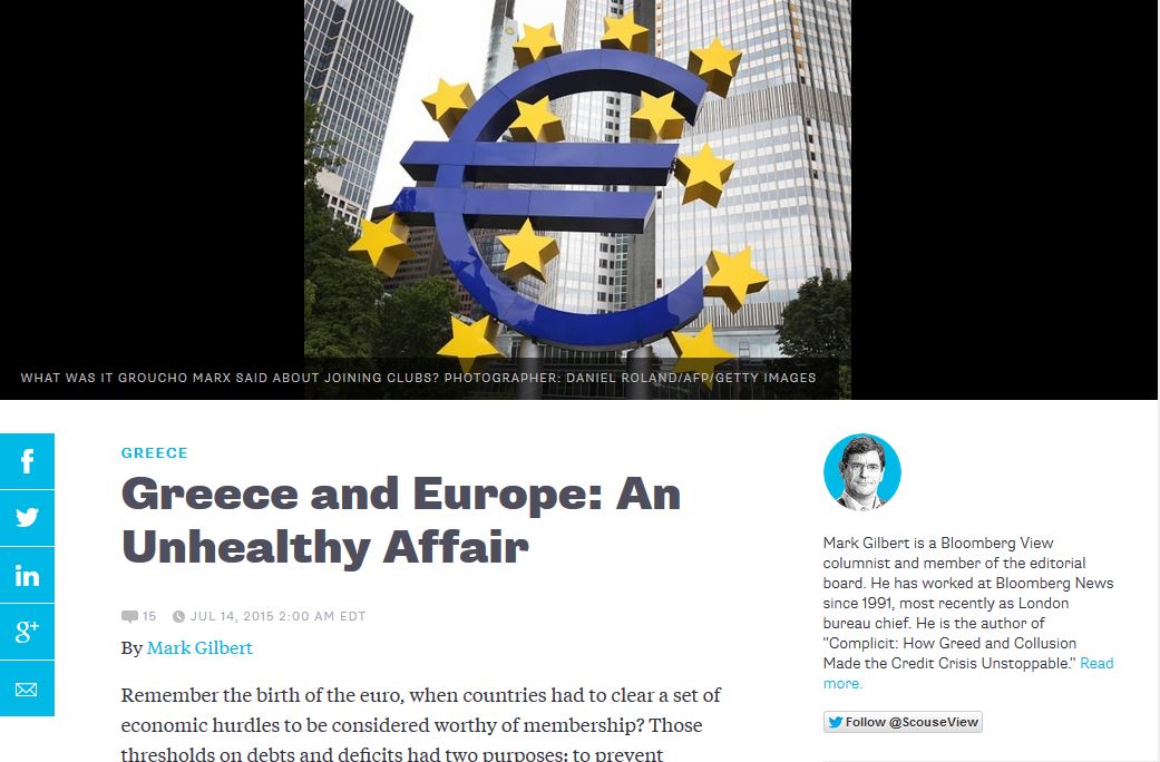 Έχω γράψει στο παρελθόν ότι το ευρώ θα ήταν καλύτερα χωρίς την Ελλάδα και η Ελλάδα θα ήταν καλύτερα χωρίς το ευρώ. Δεδομένης της ταπεινωτικής συμφωνίας που είναι αυτή τη στιγμή στο τραπέζι, είμαι περισσότερο πεπεισμένος από ποτέ ότι η διατήρηση της Ελλάδας στον οικονομικό ζουρλομανδύα του ευρώ, είναι η λάθος λύση.