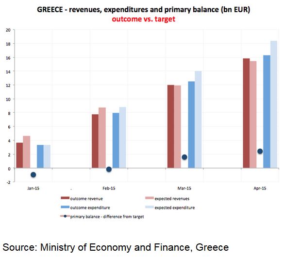 Το ισοζύγιο του κρατικού προϋπολογισμού καταγράφει έλλειμμα ύψους 508 εκατ. το διάστημα Ιανουαρίου-Απριλίου του 2015, έναντι για στόχο ελλείμματος στα 2,9 δισ ευρώ που προβλέπεται στον προϋπολογισμό του 2015, και σημαντικά χαμηλότερα από ό, τι ήταν την ίδια περίοδο του 2014 (όταν το έλλειμμα ήταν 1,15 δισ. ευρώ ).
