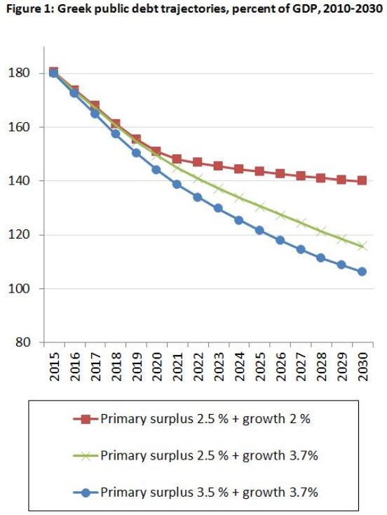 Σύμφωνα με τη βιβλιογραφία, μια δημοσιονομική προσαρμογή της τάξης του 1% του ΑΕΠ κάθε χρόνο θα οδηγήσει σε απώλειες στο ΑΕΠ της τάξης του 1%. Η Ελλάδα -σημειώνει ο αρθρογράφος- έχει ένα δίκιο που ζητά χαμηλότερα πρωτογενή πλεονάσματα, δεδομένου ότι έχει ήδη χάσει το 25% του ΑΕΠ της. Τα πλεονάσματα αυτά πρέπει να είναι 0,75% για φέτος, 1,25% για το 2016 και 2,5% για τα επόμενα χρόνια.