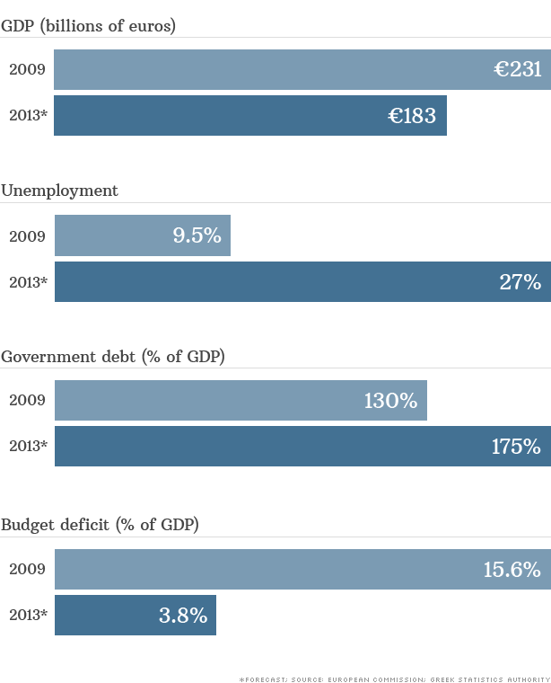 Το ΑΕΠ έχει υποστεί αισθητή συρρίκνωση, το ποσοστό της ανεργίας έχει τριπλασιαστεί, το δημόσιο χρέος έχει εκτιναχθεί εξαιτίας των νέων δανείων σε άνευ προηγούμενου επίπεδα άνω του 170% και μόνη θετική εξέλιξη είναι η δραστική μείωση του δημοσιονομικού ελλείμματος, το οποίο υπολογίζεται ότι θα διαμορφωθεί στο 3,8% στα τέλη του έτους.