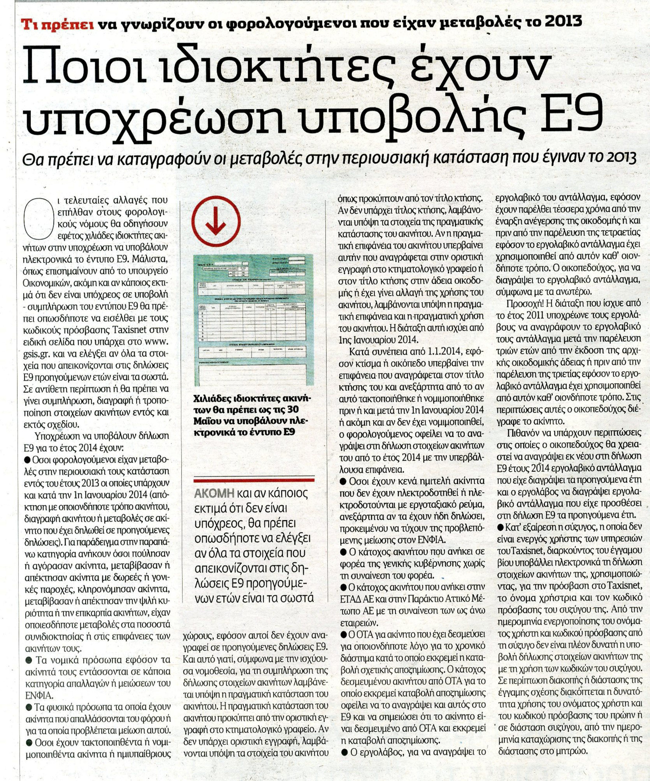Οι τελευταίες αλλαγές που επήλθαν στους φορολογικούς νόμους θα οδηγήσουν φέτος χιλιάδες ιδιοκτήτες ακινήτων στην υποχρέωση να υποβάλουν ηλεκτρονικά το έντυπο Ε9.