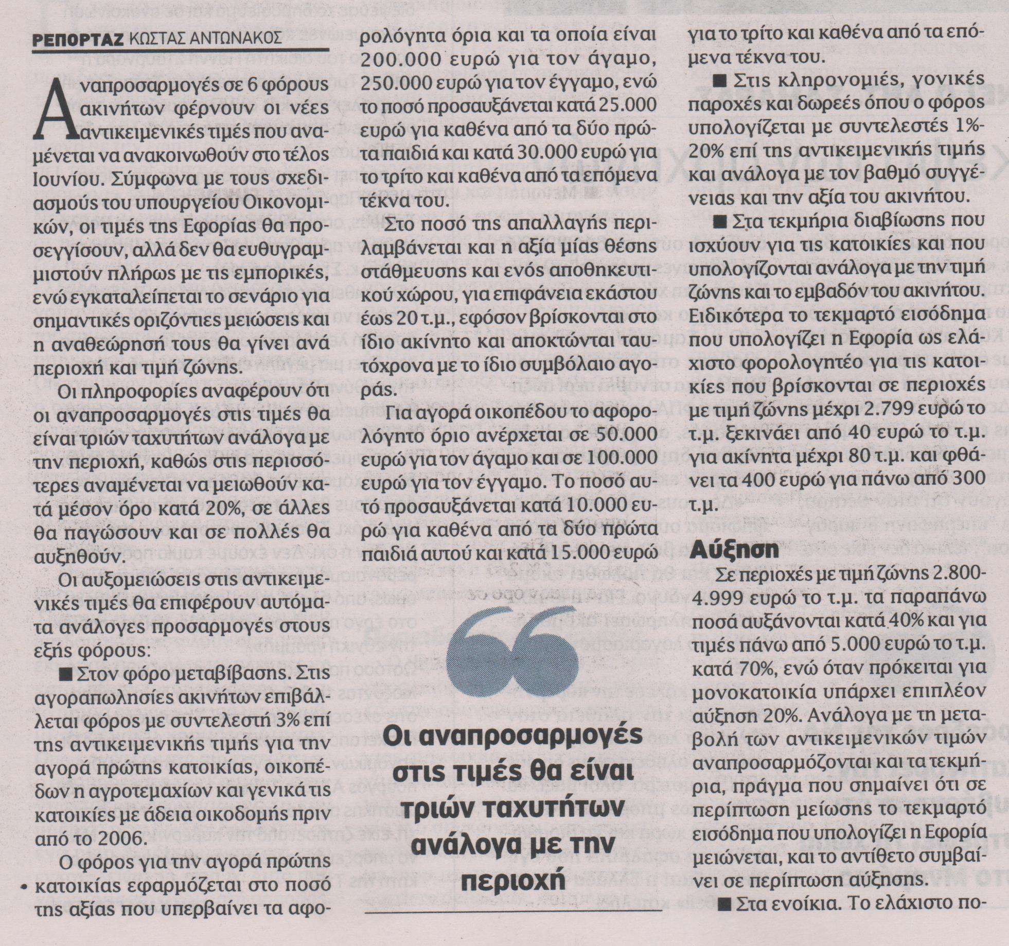 Αναπροσαρμογές σε 6 φόρους ακινήτων φέρνουν οι νέες αντικειμενικές τιμές που αναμένεται να ανακοινωθούν στο τέλος Ιουνίου. Σύμφωνα με τους σχεδιασμούς του υπουργείου Οικονομικών, οι τιμές της Εφορίας θα προσεγγίσουν, αλλά δεν θα ευθυγραμμιστούν πλήρως με τις εμπορικές, ενώ εγκαταλείπεται το σενάριο για σημαντικές οριζόντιες μειώσεις και η αναθεώρησή τους θα γίνει ανά περιοχή και τιμή ζώνης.