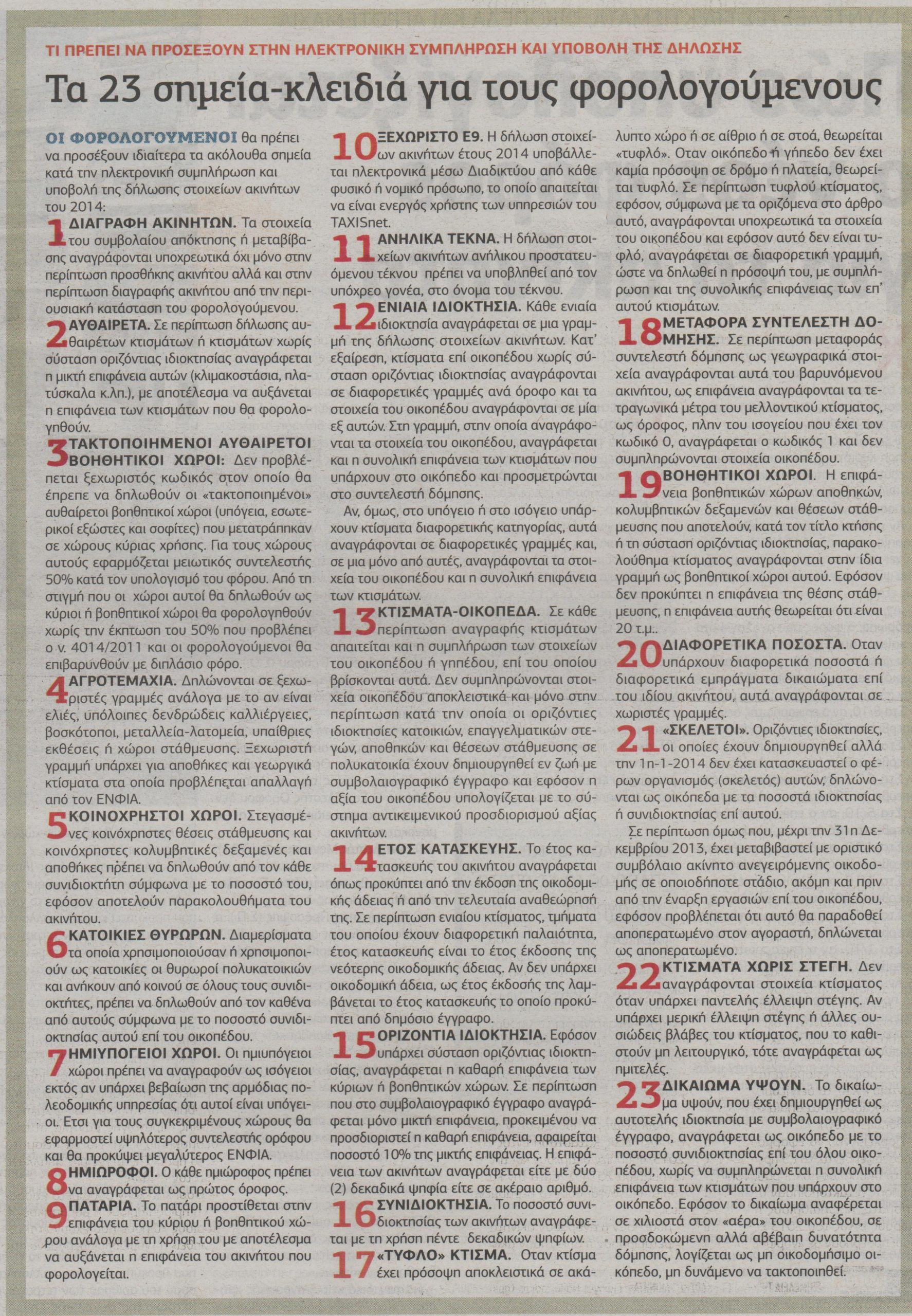 Δήλωση Ε9 για το 2014 θα κληθούν να υποβάλουν πάνω από 1,5 εκατομμύριο φορολογούμενοι, είτε για να επικαιροποιήσουν την κατάσταση της ακίνητης περιουσίας τους, παρέχοντας στη Φορολογική Διοίκηση πρόσθετες πληροφορίες αναγκαίες για τον ορθό υπολογισμό του νέου Ενιαίου Φόρου Ιδιοκτησίας Ακινήτων (ΕΝ.Φ.Ι.Α) είτε για να δηλώσουν αλλαγές στην ακίνητη περιουσία τους, που έλαβαν χώρα κατά τη διάρκεια του 2013.