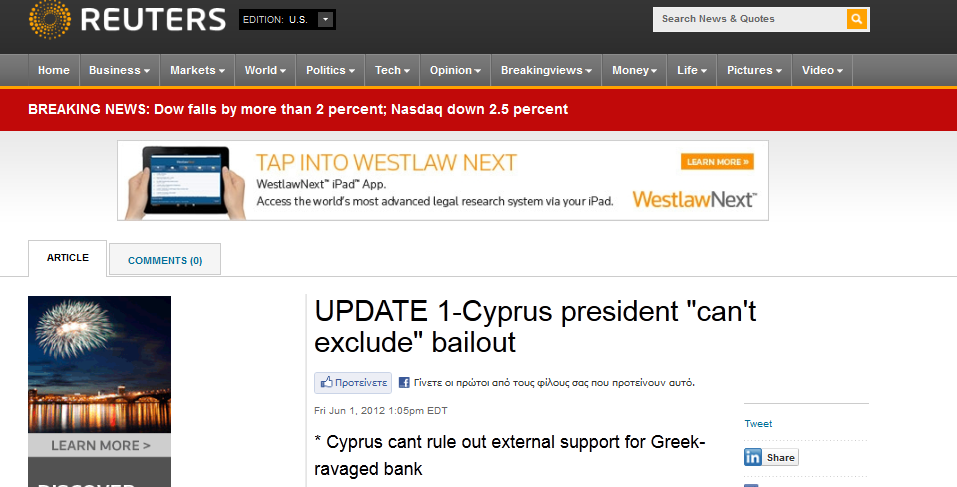 O Κύπριος πρόεδρος Δημήτρης Χριστόφιας δήλωσε ότι δεν μπορεί να αποκλείσει το ενδεχόμενο να ενταχθεί η χώρα του σε πρόγραμμα στήριξης της Ε.Ε, λόγω της έκθεση των τραπεζών στην Ελλάδα, σύμφωνα με το Reuters.Ωστόσο, κάτι τέτοιο δεν πρέπει να θεωρείται κάτι δεδομένο: “Δεν το παίρνω ως δεδομένο ότι θα διαπραγματευτούμε την είσοδο στο μηχανισμό στήριξης, αλλά δεν θέλω να το αποκλείσω και τελείως”, τόνισε.