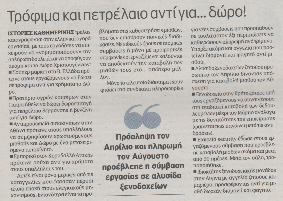 Άλλωστε δεν είναι λίγοι οι εργοδότες που επιχειρούν να αποφύγουν ακόμη και το δώρο Χριστουγέννων, παρότι η μη εμπρόθεσμη πληρωμή του επισύρει αυτόφωρο (εξάμηνη φυλάκιση, πρόστιμο κλπ).