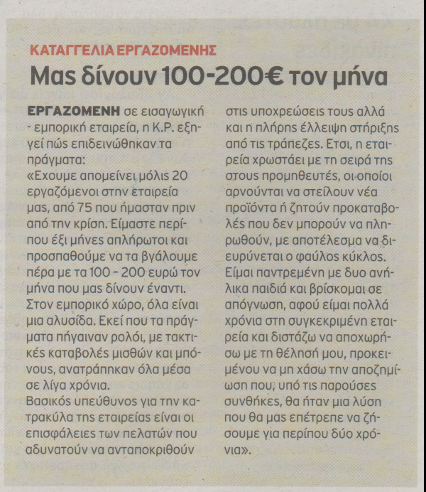 Η ελληνική αγορά εργασίας έχει πλήρως απορρυθμιστεί, καθώς μόνο τέσσερις στους δέκα εργαζόμενους παίρνουν μισθό χωρίς καθυστέρηση στον ιδιωτικό τομέα. Οι υπόλοιποι κάνουν υπομονή ή συμβιβάζονται με συμβολικά ποσά που «αντικαθιστούν» το μηνιάτικο.