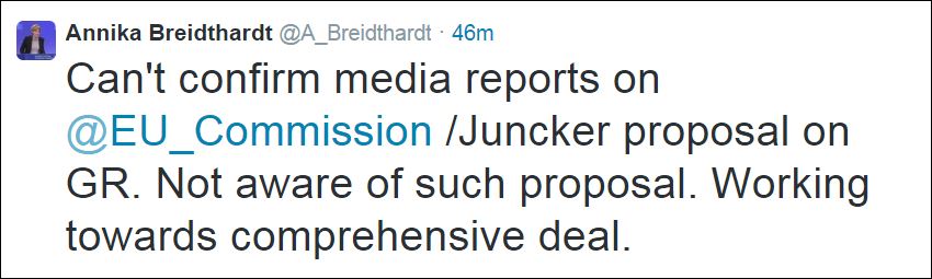 «Δεν μπορώ να επιβεβαιώσω τις αναφορές των ΜΜΕ αναφορικά με την πρόταση Κομισιόν/Γιουνκέρ για την Ελλάδα. Δεν γνωρίζω κάτι για μία τέτοια πρόταση. Εργαζόμαστε για την επίτευξη μίας συνολικής συμφωνίας» έγραψε η εκπρόσωπος της Κομισιόν.