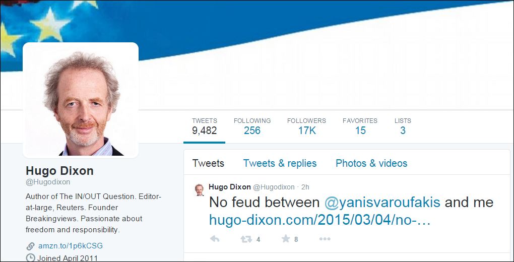 “To αρχικό σχόλιο μου στις 2 Μαρτίου, έλεγε ότι ήταν “ανόητο από τον κ. Βαρουφάκη να πει ότι η κυέρνηση ενδεχομένως να μην είναι σε θέση να πληρώσει το ΔΝΤ”. Εκείνος απάντησε στις 3 Μαρτίου λέγοντας ότι “Ποτέ δεν το είπα αυτό Hugo” και με ενθάρρυνε να φρεσκάρω τα ελληνικά μου ή να βρω καλύτερες πηγές. Από τεχνική άποψη, αυτό συμβαίνει. Ο υπουργός Οικονομικών είπε στον Alpha στις 25, Φεβρουαρίου: “Θα έχουμε σίγουρα ένα πρόβλημα να εξοφλήσουμε τώρα τις δόσεις προς το ΔΝΤ τώρα” “, αναφέρει ο Dixon επισυνάπτοντας το σχετικό link από το reuters.