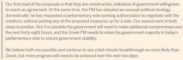 Η συμφωνία παραμένει πιο πιθανή από το Grexit, αλλά οι κίνδυνοι είναι μεγάλοι και απαιτείται περαιτέρω πρόοδος, αναφέρει.