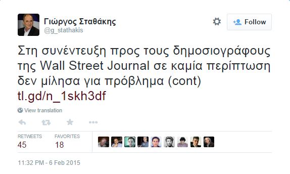 Συγκεκριμένα η ανάρτηση στο twitter έχει ως εξής: Στη συνέντευξη προς τους δημοσιογράφους της Wall Street Journal σε καμία περίπτωση δεν μίλησα για πρόβλημα ρευστότητας που θα αντιμετωπίσει το ελληνικό Δημόσιο τον Μάρτιο. Κάτι τέτοιο δεν ισχύει. Οι προγραμματικές δηλώσεις που θα παρουσιάσουμε στη Βουλή περιγράφουν το σχέδιο που θα αυξήσει τα φορολογικά έσοδα, εξασφαλίζοντας τις απαραίτητες ταμειακές ροές. Δεν θα προκύψει οποιοδήποτε πρόβλημα μέχρι το καλοκαίρι και την ολοκλήρωση της συμφωνίας.