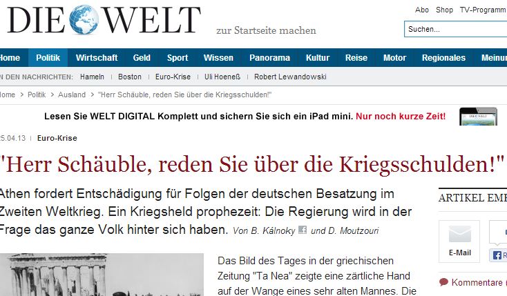 Ρεπορτάζ για τις αξιώσεις της Αθήνας σχετικά με τις γερμανικές αποζημιώσεις φιλοξενεί η έγκυρη συντηρητική εφημερίδα της Γερμανίας Die Welt.