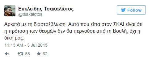 «Αρκετά με τη διαστρέβλωση. Αυτό που είπα στον ΣΚΑΪ είναι ότι η πρόταση των θεσμών δεν θα περνούσε από τη Βουλή, όχι η δική μας», έγραψε χαρακτηρσιτικά.