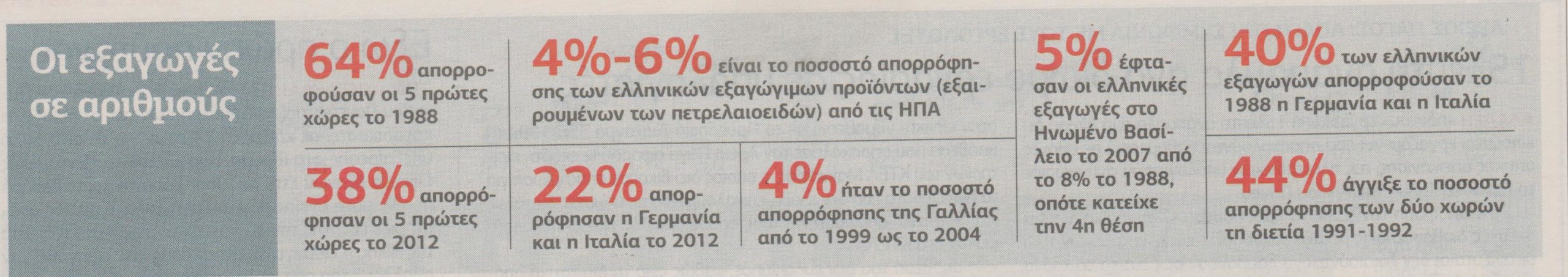 Έτσι, ενώ το 1988 οι πέντε πρώτες αγορές εξαγωγών ελληνικών προϊόντων ήταν η Γερμανία, η Ιταλία, η Γαλλία, το Ηνωμένο Βασίλειο και οι ΗΠΑ, απορροφώντας το 64% των εξαγώγιμων προϊόντων, το 2012 ανέδειξε κορυφαίες χώρες την Ιταλία, τη Γερμανία, τη Βουλγαρία, την Κύπρο και την Τουρκία, οι οποίες απορρόφησαν το 38% των εξαγωγών ελληνικών προϊόντων, γεγονός που δείχνει πως οι Έλληνες εξαγωγείς έχουν αρχίσει και ανοίγονται και σε νέες χώρες.