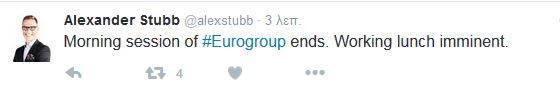 Όπως ανακοίνωσε στο Twitter o υπουργός Οικονομικών της Φινλανδίας, Αλεξάντερ Στουμπ, οι εργασίες σταμάτησαν για να απολαύσουν οι υπουργοί, το μεσημεριανό τους.