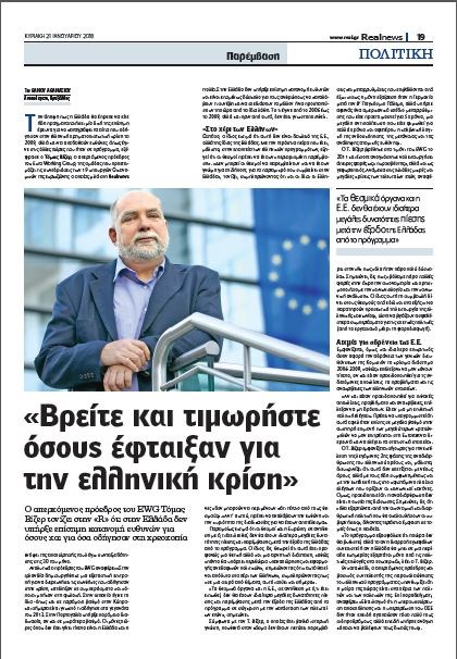 Την άποψη πως η Ελλάδα θα έπρεπε να είχε ήδη πραγματοποιήσει μία δική της επίσημη έρευνα για να καταγράψει τα αίτια που οδήγησαν στην ελληνική χρηματοπιστωτική κρίση το 2009, αλλά και να αποδοθούν ευθύνες, όπως έγινε στις άλλες χώρες που ήταν σε πρόγραμμα, εξέφρασε ο Τόμας Βίζερ, απερχόμενος πρόεδρος του Euro Working Group, της ομάδας που προετοιμάζει τις συνεδριάσεις των 19 υπουργών Οικονομίας της Ευρωζώνης, ο οποίος μιλά στη Realnews ενόψει της αποχώρησής του λόγω συνταξιοδότησης στις 30 του μήνα.