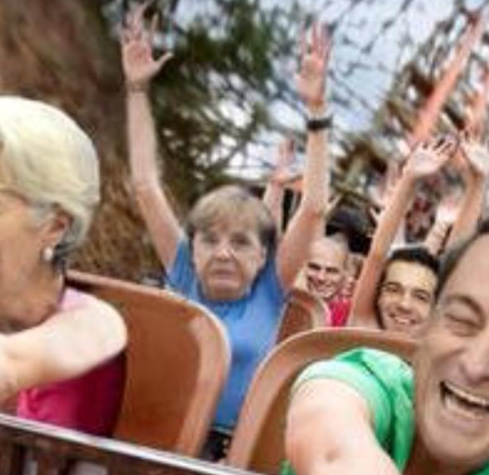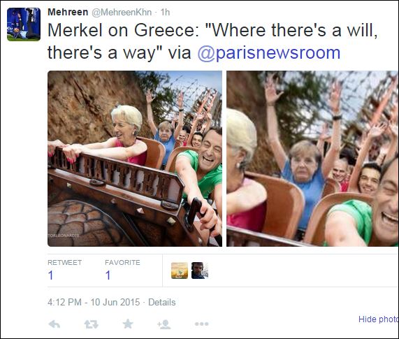 “Οπου υπάρχει βούληση, υπάρχει τρόπος” δήλωσε μεταξύ άλλων η Άνγκελα Μέρκελ για την Ελλάδα. Αυτή της η φράση ενέπνευσε τον δημοσιογράφο της βρετανικής Telegraph Mehreen Khan που σχολιάζοντας τη δήλωση έκανε ένα κολάζ με ένα τρενάκι του λούνα πάρκ. Στην πρώτη σειρά κάθονται η Κριστίν Λαγκάρντ και ο Μάριο Ντράγκι, οι οποίοι είναι φαίνεται να απολαμβάνουν τη βόλτα, ενώ πίσω τους η Άνγκελα Μέρκελ που έχει σηκωμένα τα χέρια. Ακόμα πιο πίσω ο Αλέξης Τσίπρας και στο βάθος διακρίνεται ο Γιάνης Βαρουφάκης.