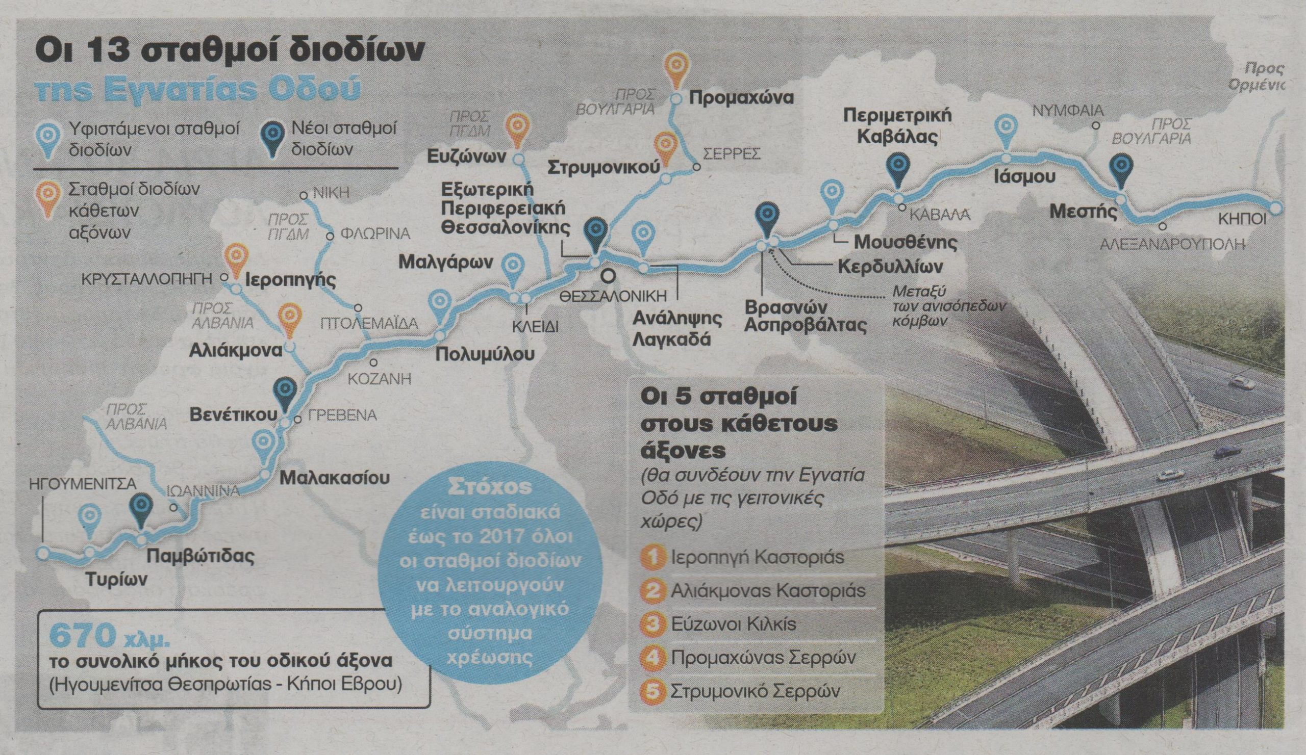 Το οριστικό μοντέλο για τη χωροθέτηση των διοδίων στον κεντρικό άξονα που διασχίζει την Βόρεια Ελλάδα από την Ηγουμενίτσα έως τον Έβρο συμφωνήθηκε την περασμένη εβδομάδα μεταξύ υπουργείου Υποδομών, ΤΑΙΠΕΔ και διοίκησης της Εγνατίας Οδού και προβλέπει συνολικά 13 σταθμούς, μαζί με άλλους 5 που θα λειτουργούν στους κάθετους άξονες, εκείνους δηλαδή που θα συνδέουν τον αυτοκινητόδρομο με τις γειτονικές χώρες.