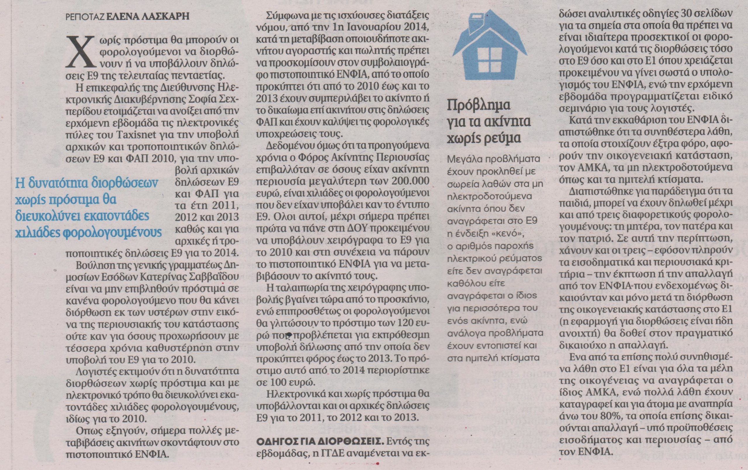 Η επικεφαλής της Διεύθυνσης Ηλεκτρονικής Διακυβέρνησης, Σοφία Σεχπερίδου ετοιμάζεται να ανοίξει από την ερχόμενη εβδομάδα τις ηλεκτρονικές πύλες του Taxisnet για την υποβολή αρχικών και τροποποιητικών δηλώσεων Ε9 και ΦΑΠ 2010, για την υποβολή αρχικών δηλώσεων Ε9 και ΦΑΠ για τα έτη 2011, 2012 και 2013 καθώς και για αρχικές ή τροποποιητικές δηλώσεις Ε9 για το 2014.