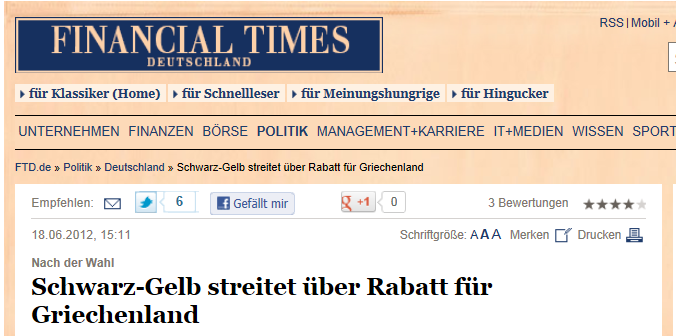 Διαφορετικές προσεγγίσεις σε ό, τι αφορά την προοπτική παραχώρησης ελαφρύνσεων στο ελληνικό πρόγραμμα στήριξης, διαπιστώνονται στο εσωτερικό του κυβερνητικού συνασπισμού της Γερμανίας, σύμφωνα με αποκλειστικές πληροφορίες τις οποίες επικαλούνται οι Financial Times Deutschland.Όπως αναφέρεται σε δημοσίευμα, στην ηλεκτρονική σελίδα της εφημερίδας, η Καγκελάριος ‘Ανγκελα Μέρκελ «έβαλε στη θέση του» σήμερα τον υπουργό Εξωτερικών, Γκίντο Βεστερβέλε, στέλεχος της ελάσσονος αντιπολίτευσης, FDP, ο οποίος είχε, ήδη χθες το βράδυ, δηλώσει ότι η Γερμανία είναι έτοιμη να συζητήσει το χρονοδιάγραμμα, αλλά όχι την ουσία του προγράμματος για την Ελλάδα. Παραπέμπει δε στη σημερινή δήλωση του αναπληρωτή κυβερνητικού εκπροσώπου της γερμανικής κυβέρνησης Γκέοργκ Στράιτερ, ότι «δεν είναι καιρός για τυχόν εκπτώσεις» και προσθέτει ότι ισχύει ό, τι συμφωνηθεί.Σύμφωνα με την εφημερίδα, η κατάσταση αποδεικνύει πόσο δύσκολο είναι να βρεθεί η απαραίτητη ισορροπία ακόμη και εντός της κυβέρνησης για την αντιμετώπιση της ελληνικής κρίσης. «Από τη μια πλευρά πρέπει να διατηρηθεί η πίεση για μεταρρυθμίσεις προς την υπερχρεωμένη χώρα, αλλά από την άλλη μια έξοδος της Ελλάδας από την Ευρωζώνη θα κατέστρεφε την ευρωπαϊκή πορεία της κυρίας Μέρκελ», επισημαίνεται.