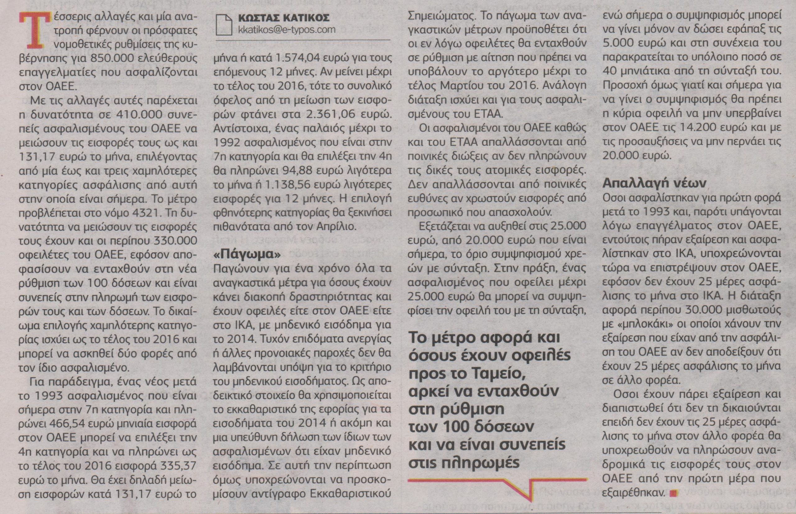Με τις αλλαγές αυτές παρέχεται η δυνατότητα σε 410.000 συνεπείς ασφαλισμένους του ΟΑΕΕ να μειώσουν τις εισφορές τους ως και 131,17 ευρώ το μήνα, επιλέγοντας από μία έως και τρεις χαμηλότερες κατηγορίες ασφάλισης από αυτή στην οποία είναι σήμερα. Το μέτρο προβλέπεται στο νόμο 4321. Τη δυνατότητα να μειώσουν τις εισφορές τους έχουν και οι περίπου 330.000 οφειλέτες του ΟΑΕΕ, εφόσον αποφασίσουν να ενταχθούν στη νέα ρύθμιση των 100 δόσεων και είναι συνεπείς στην πληρωμή των εισφορών τους και των δόσεων.