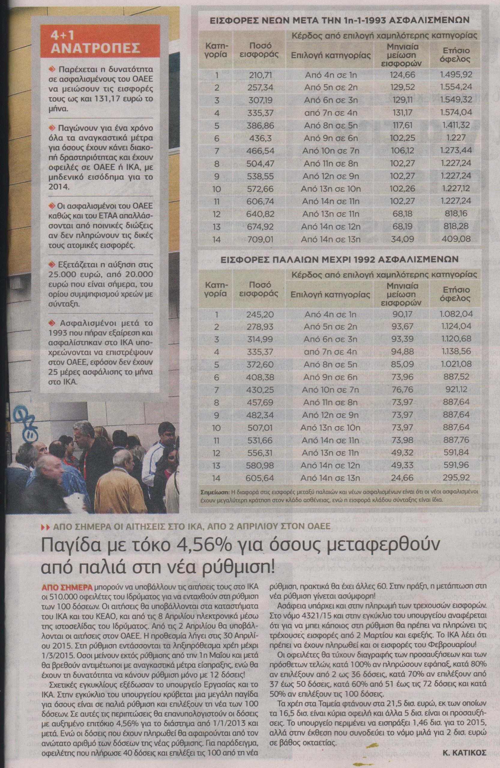 Με τις αλλαγές αυτές παρέχεται η δυνατότητα σε 410.000 συνεπείς ασφαλισμένους του ΟΑΕΕ να μειώσουν τις εισφορές τους ως και 131,17 ευρώ το μήνα, επιλέγοντας από μία έως και τρεις χαμηλότερες κατηγορίες ασφάλισης από αυτή στην οποία είναι σήμερα. Το μέτρο προβλέπεται στο νόμο 4321. Τη δυνατότητα να μειώσουν τις εισφορές τους έχουν και οι περίπου 330.000 οφειλέτες του ΟΑΕΕ, εφόσον αποφασίσουν να ενταχθούν στη νέα ρύθμιση των 100 δόσεων και είναι συνεπείς στην πληρωμή των εισφορών τους και των δόσεων.