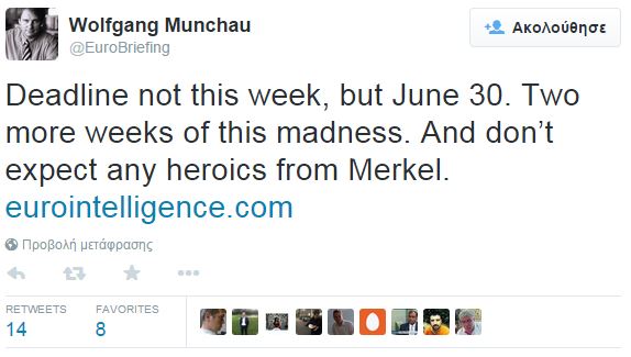 «Η προθεσμία για συμφωνία δεν λήγει αυτή την εβδομάδα, αλλά στις 30 Ιουνίου. Και μην περιμένετε ηρωισμούς από την Μέρκελ», γράφει στο twitter παραπέμποντας σε δικό του άρθρο στο Eurointelligence.