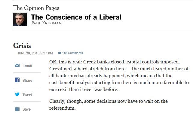 Τώρα λοιπόν τα πράγματα είναι σοβαρά: οι ελληνικές τράπεζες έκλεισαν, οι έλεγχοι στην κίνηση κεφαλαίων επιβλήθηκαν. Το Grexit δε βρίσκεται πια πολύ μακριά από αυτό το σημείο – η φοβερή και τρομερή μητέρα όλων των bank run έχει συμβεί ήδη, κάτι που σημαίνει ότι η ανάλυση κέρδους-κόστους από εδώ και στο εξής είναι πολύ πιο ευνοϊκή για το Grexit από ό,τι ήταν πριν. Ωστόσο, είναι ξεκάθαρο ότι κάποιες αποφάσεις πρέπει τώρα να περιμένουν μέχρι το δημοψήφισμα.