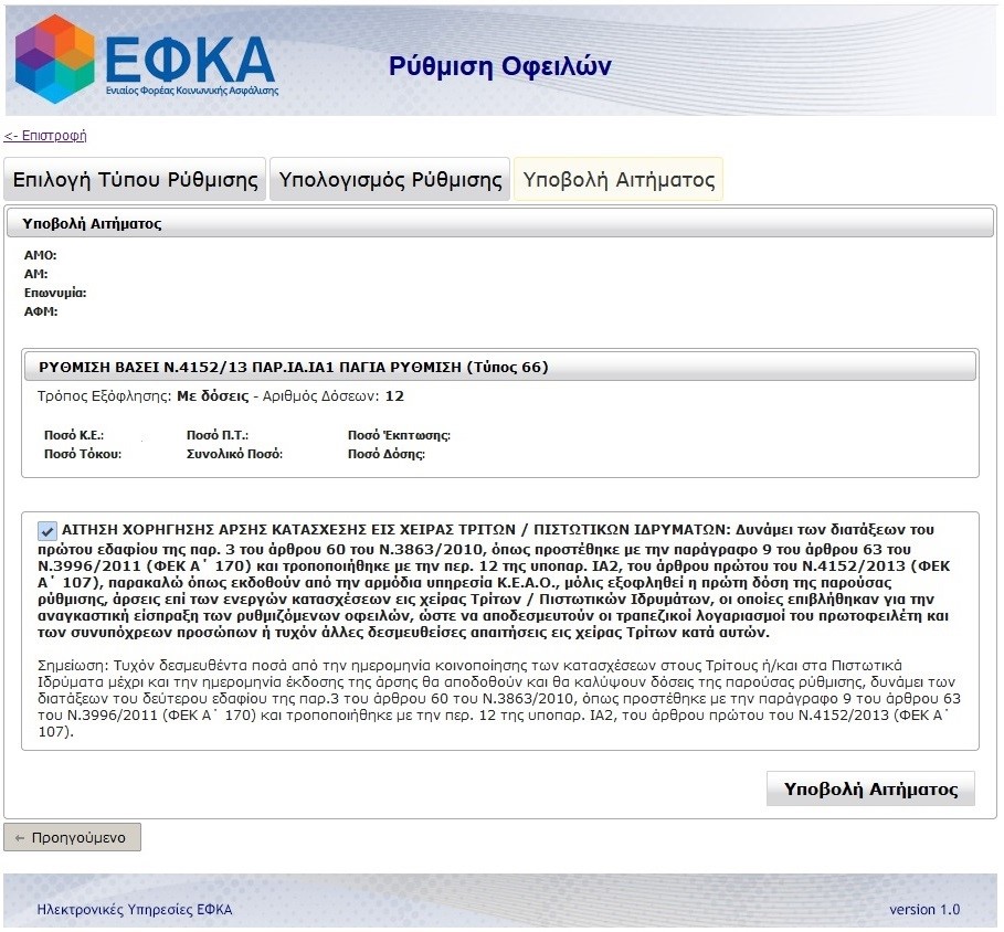 Σε λειτουργία τέθηκε η νέα ηλεκτρονική υπηρεσία του «άρσης κατάσχεσης εις χείρας Τρίτων» του e-ΕΦΚΑ. Στο πλαίσιο του ψηφιακού μετασχηματισμού των παρεχόμενων υπηρεσιών του Φορέα και της διευκόλυνσης των συναλλαγών των οφειλετών, η νέα υπηρεσία επιτρέπει ταυτόχρονα με την υποβολή αίτησης για την υπαγωγή των οφειλών σε καθεστώς ρύθμισης, την υποβολή από τον οφειλέτη αίτησης χορήγησης άρσης κατάσχεσης εις χείρας Τρίτων/Πιστωτικών Ιδρυμάτων.