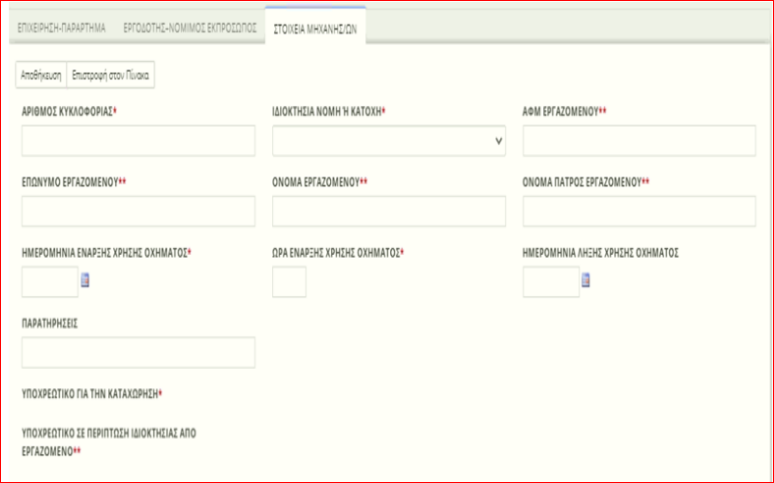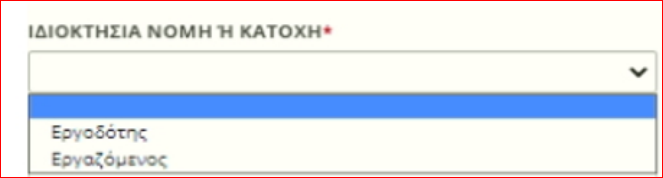 Επιλογή ανάλογα με την περίπτωση από την λίστα τιμών (Εργοδότης ή Εργαζόμενος). Στην περίπτωση που την ιδιοκτησία νομή ή κατοχή του μοτοποδήλατου ή της μοτοσυκλέτας την έχει ο Εργαζόμενος συμπληρώνονται υποχρεωτικά τα πεδία ΑΦΜ, Επώνυμο, Όνομα και Όνομα Πατρός.
