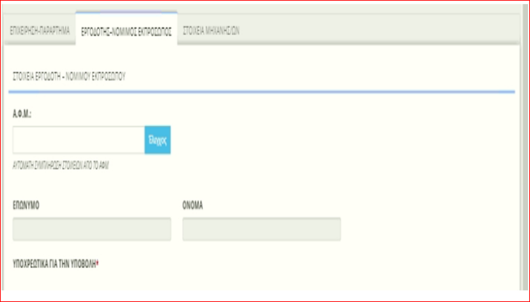 Τα πεδία «Α.Φ.Μ.», «ΕΠΩΝΥΜΙΑ», «ΠΑΡΑΡΤΗΜΑ», συμπληρώνονται αυτόματα μέσω της διαλειτουργικότητας με το ΟΠΣ e-ΕΦΚΑ.