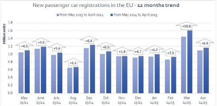 Ρεκόρ σημείωσαν οι πωλήσεις καινούριων αυτοκινήτων στην ΕΕ τον Απρίλιο του 2015 με ποσοστό αύξησης 6,9% καθώς διατέθηκαν 1,166 εκατ. ΙΧ έναντι 1,091 εκατ. οχήματα σε σχέση με τον αντίστοιχο μήνα πέρσι με την Ελλάδα να «οδηγεί» την κούρσα.