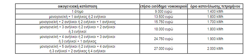 · Να ικανοποιούνται τα κριτήρια υπαγωγής στο νέο Κοινωνικό Οικιακό Τιμολόγιο (βλέπε πίνακα)